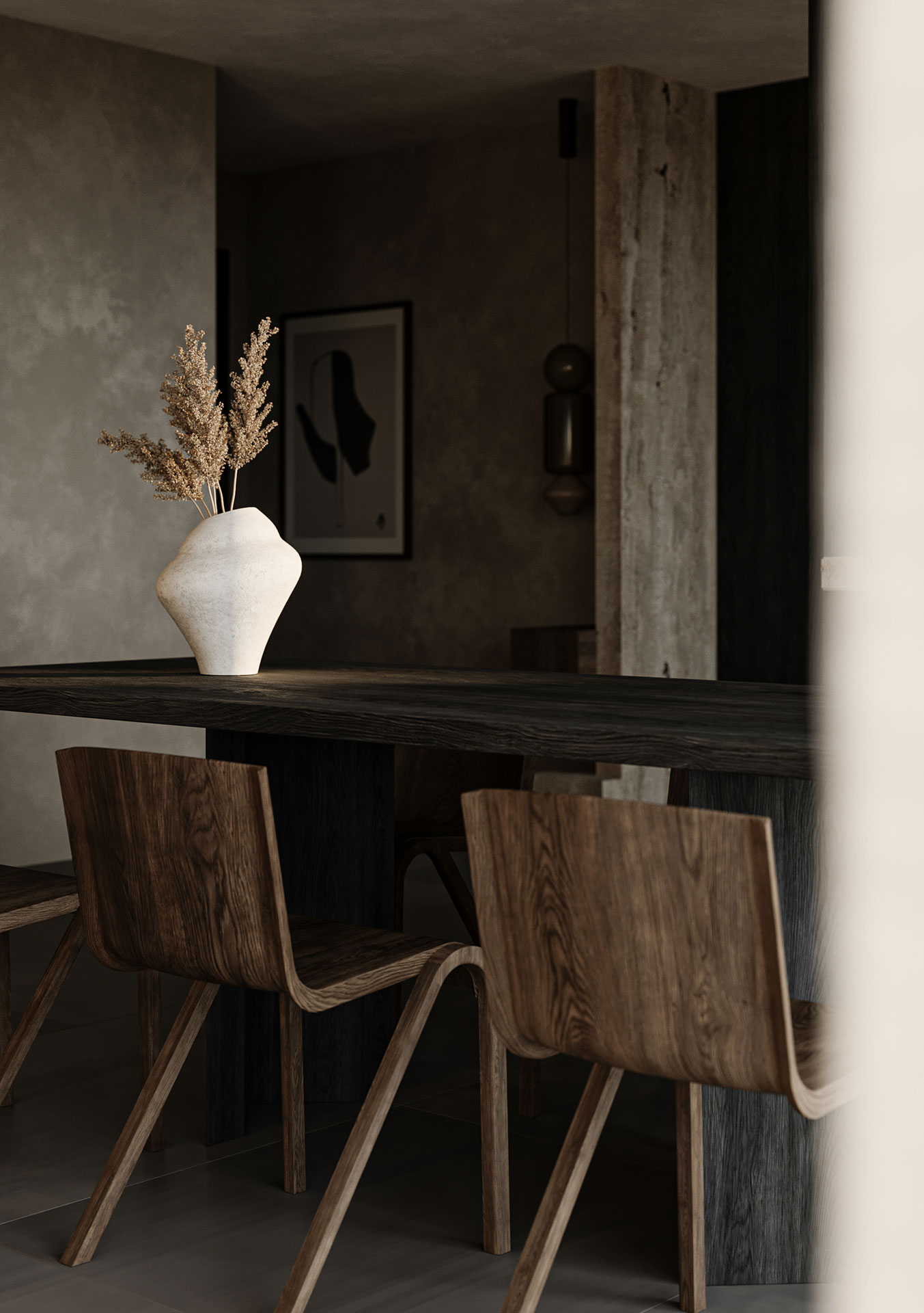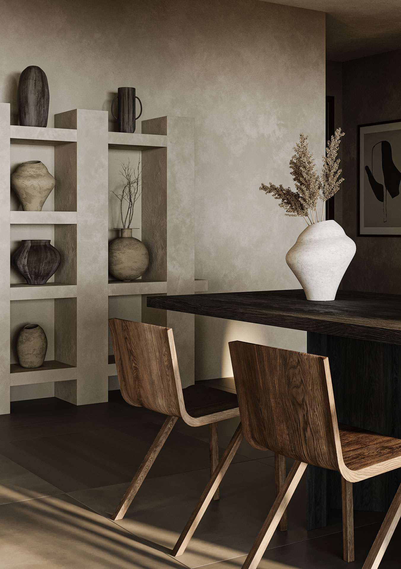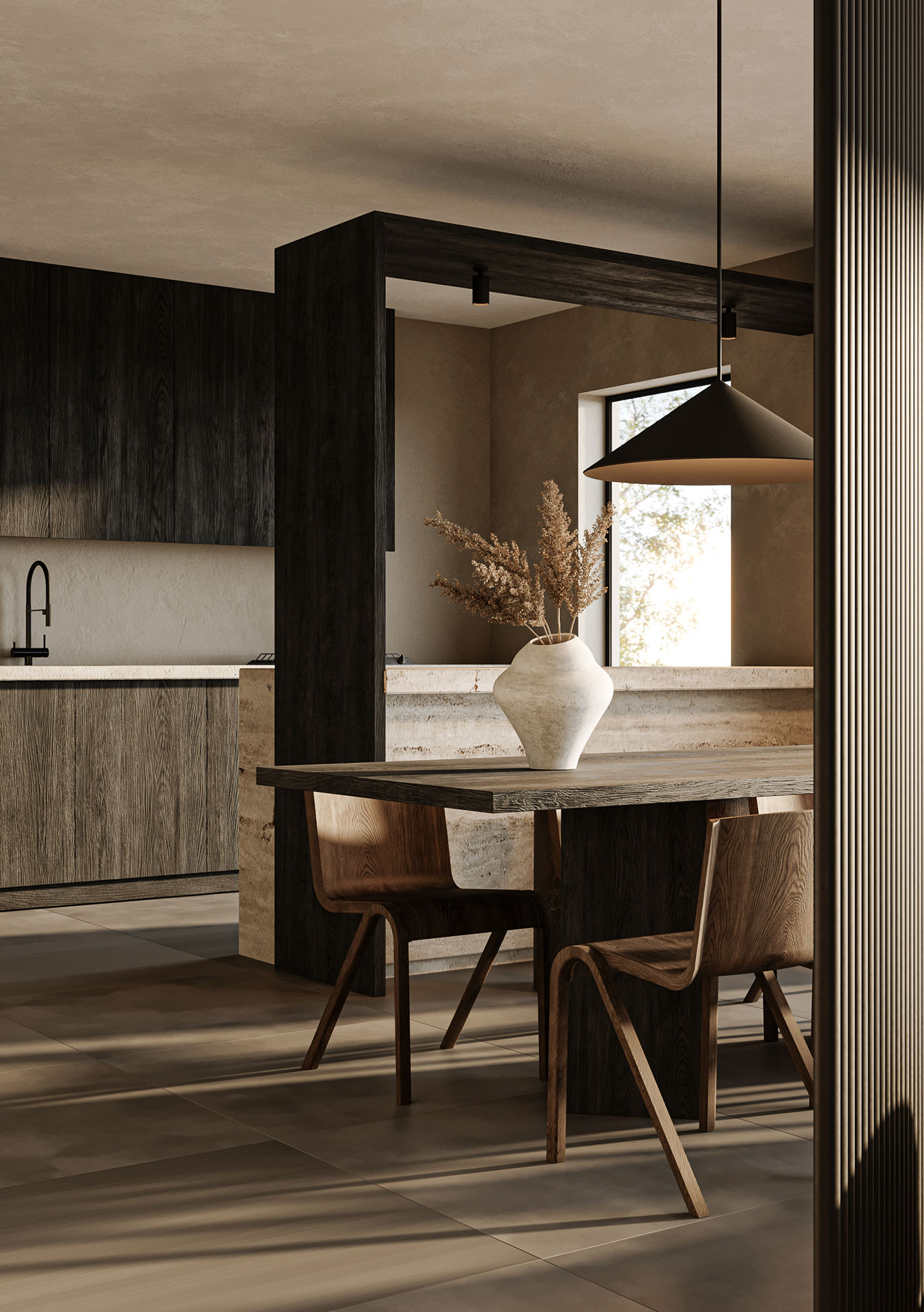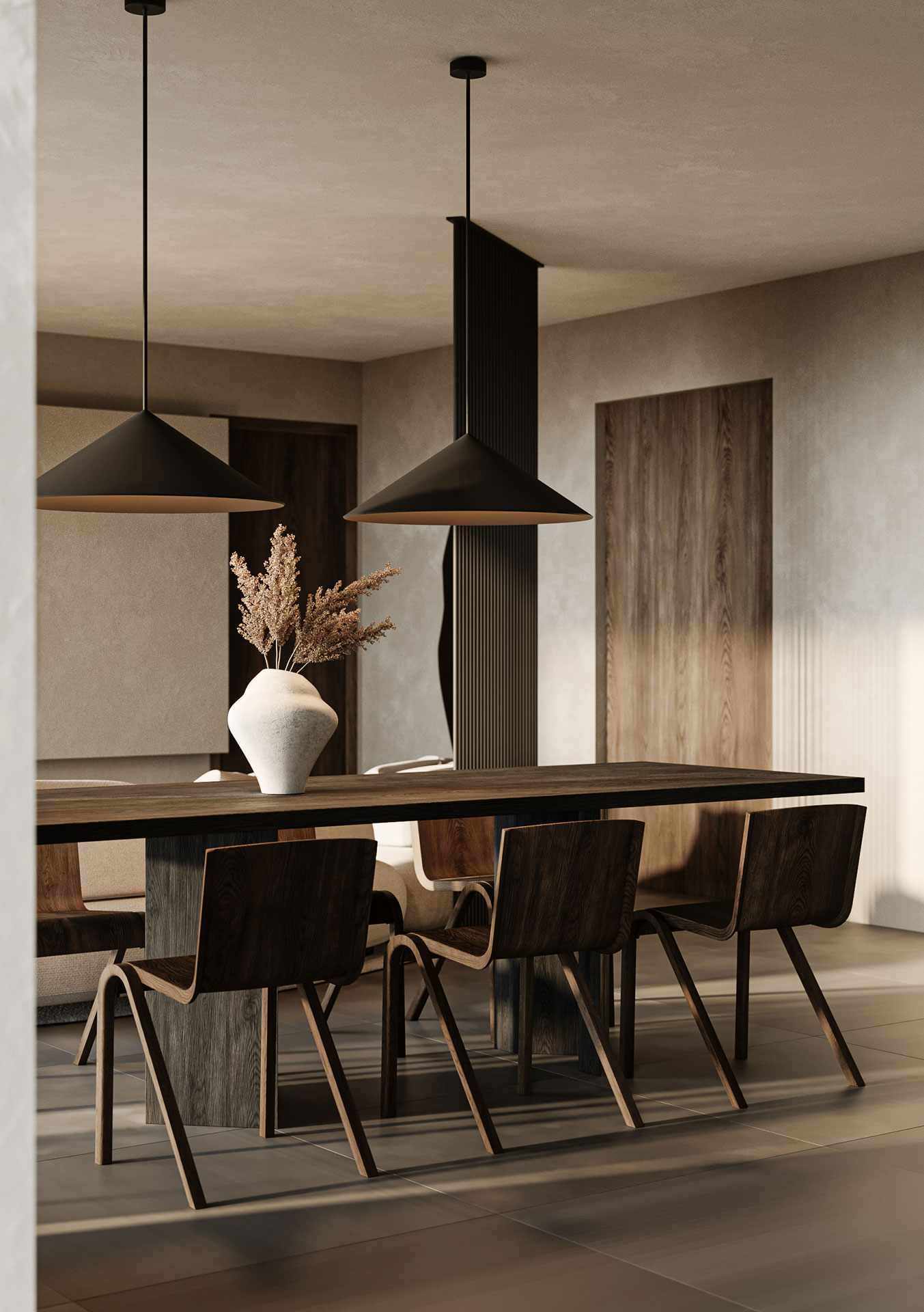 Our concept of slow living combines raw and Japandi trends with contemporary elements, creating a world of lights and shadows. Wood prevails, adding importance and majesty to the environment. Experience the harmonious blend of styles in this interior.