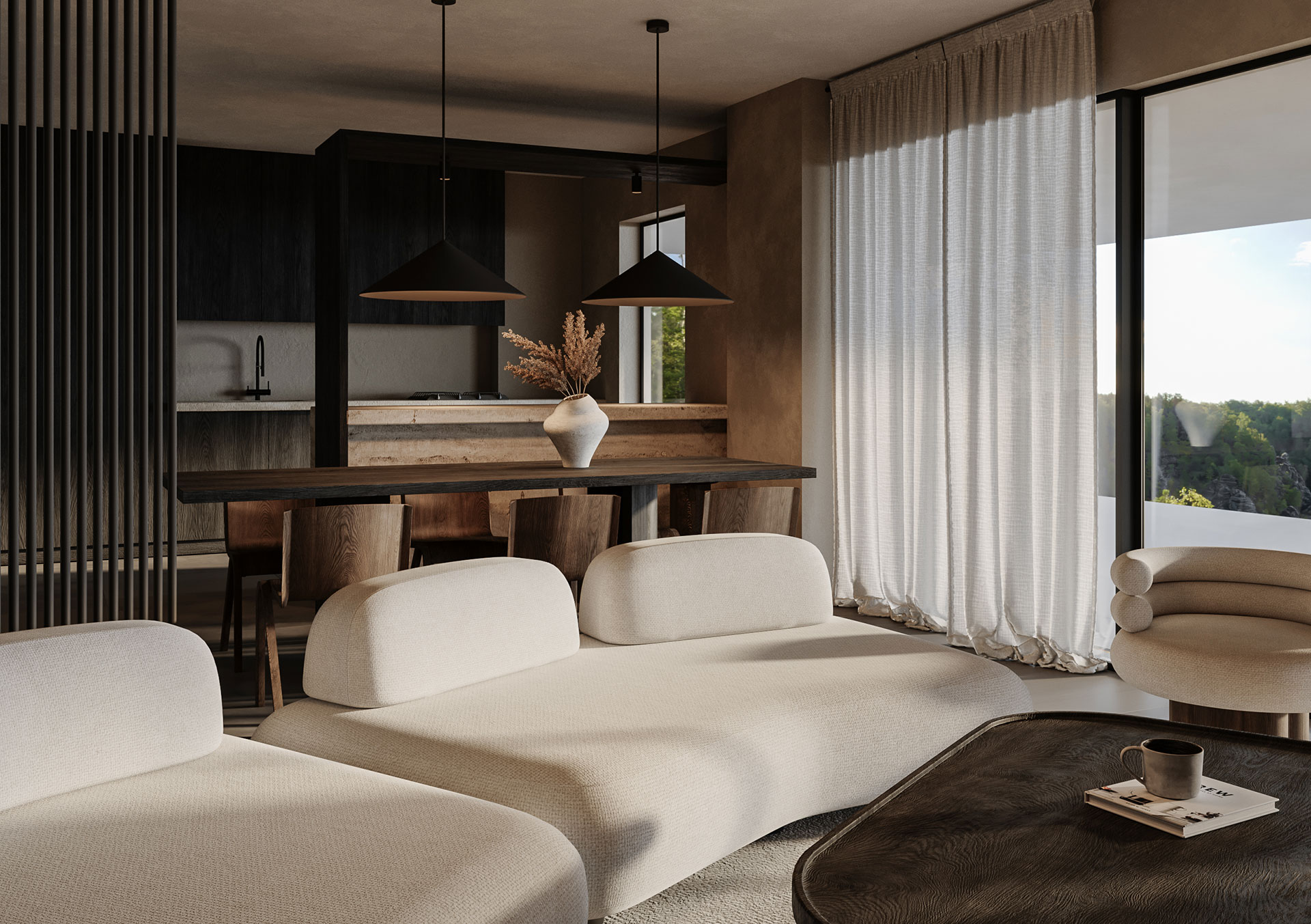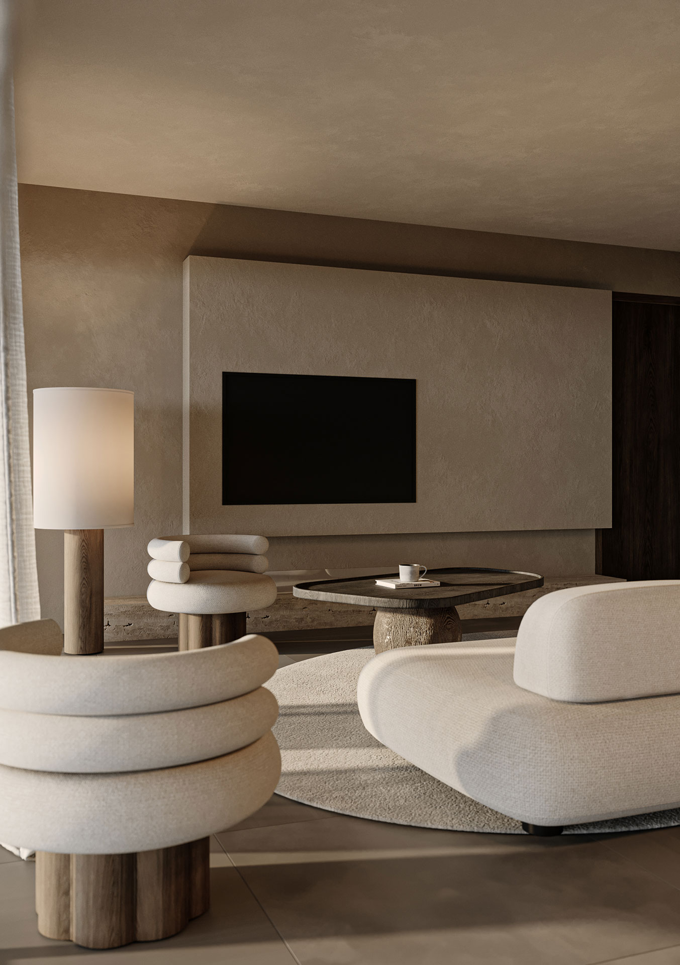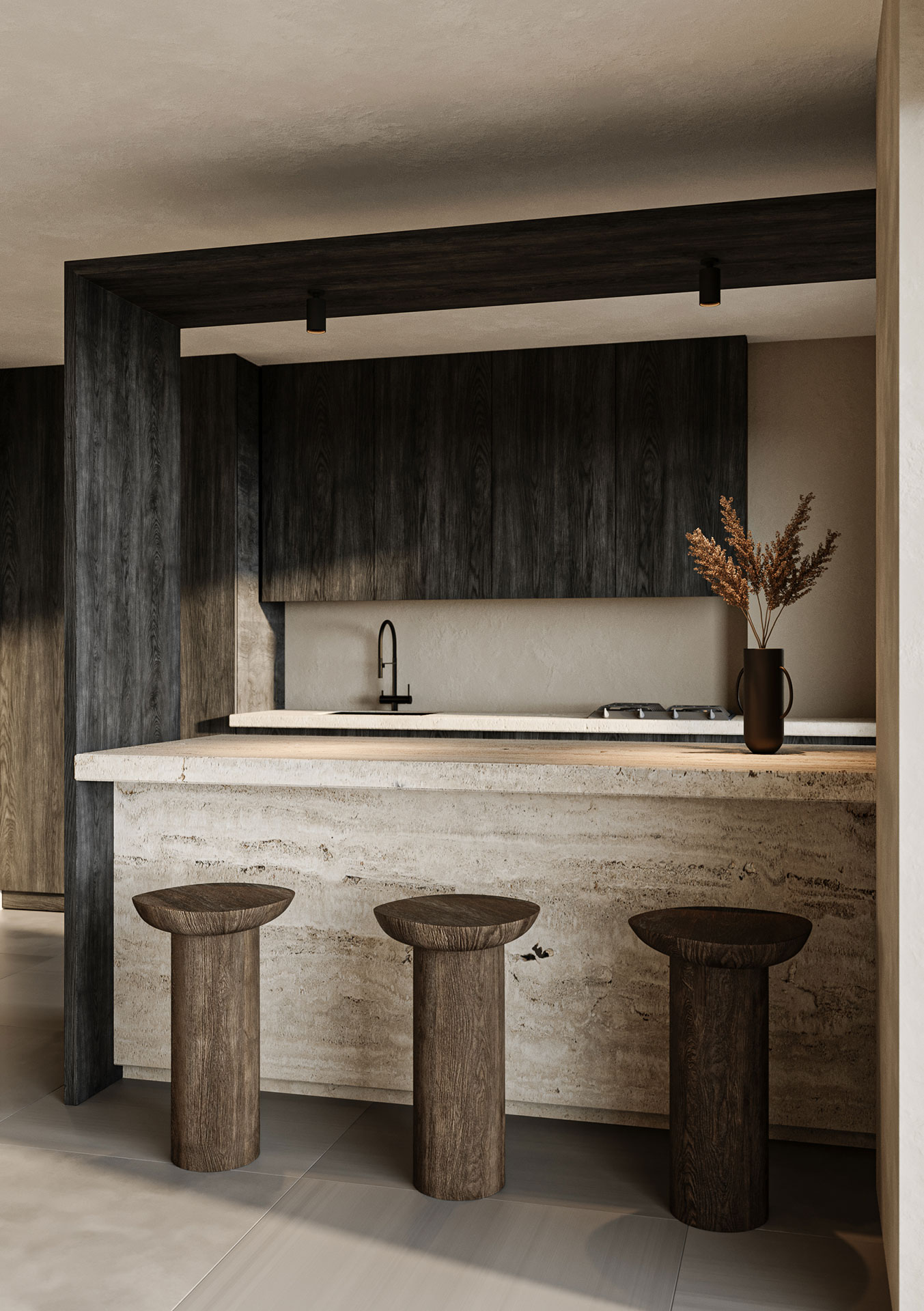 Our concept of slow living combines raw and Japandi trends with contemporary elements, creating a world of lights and shadows. Wood prevails, adding importance and majesty to the environment. Experience the harmonious blend of styles in this interior.
