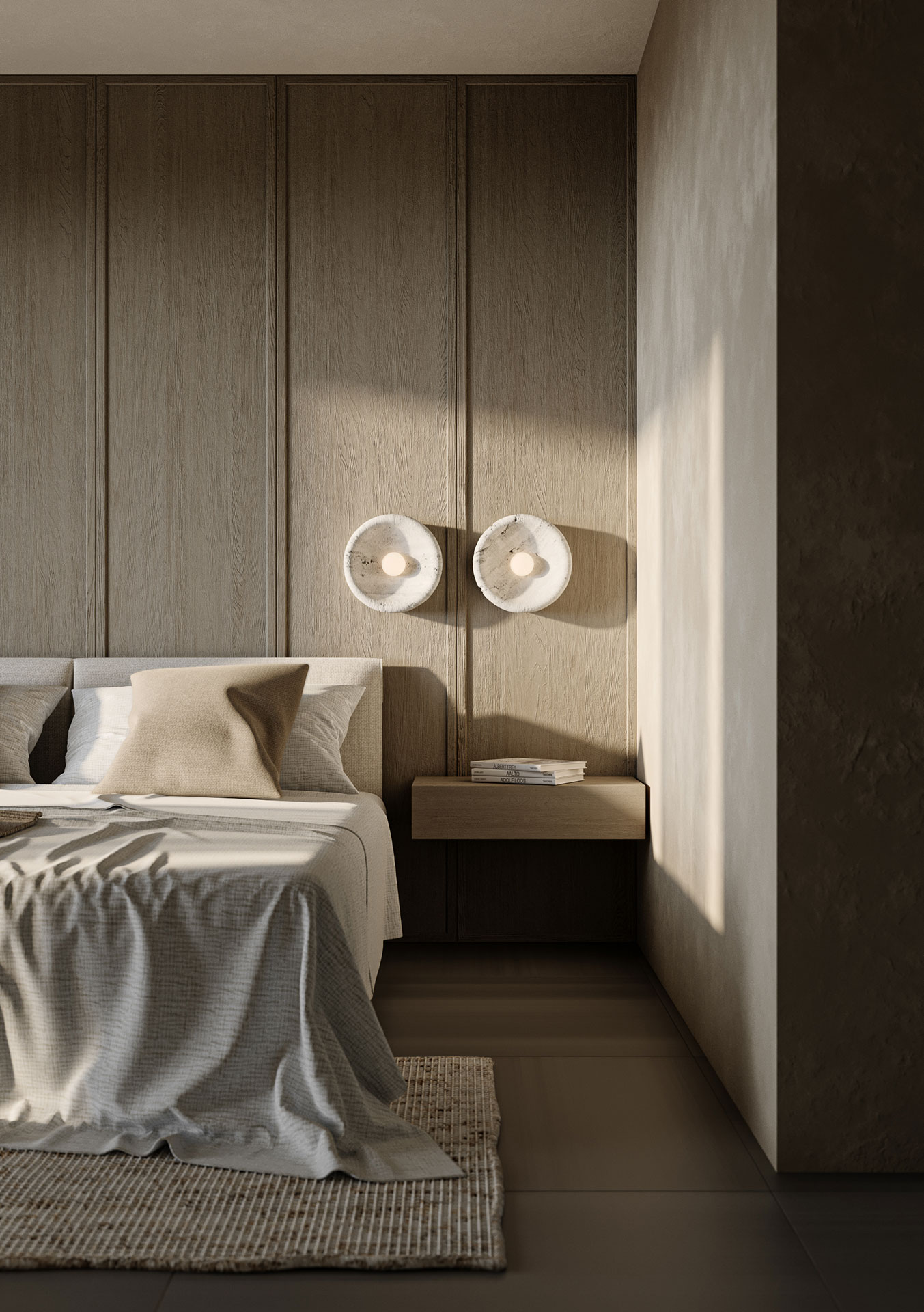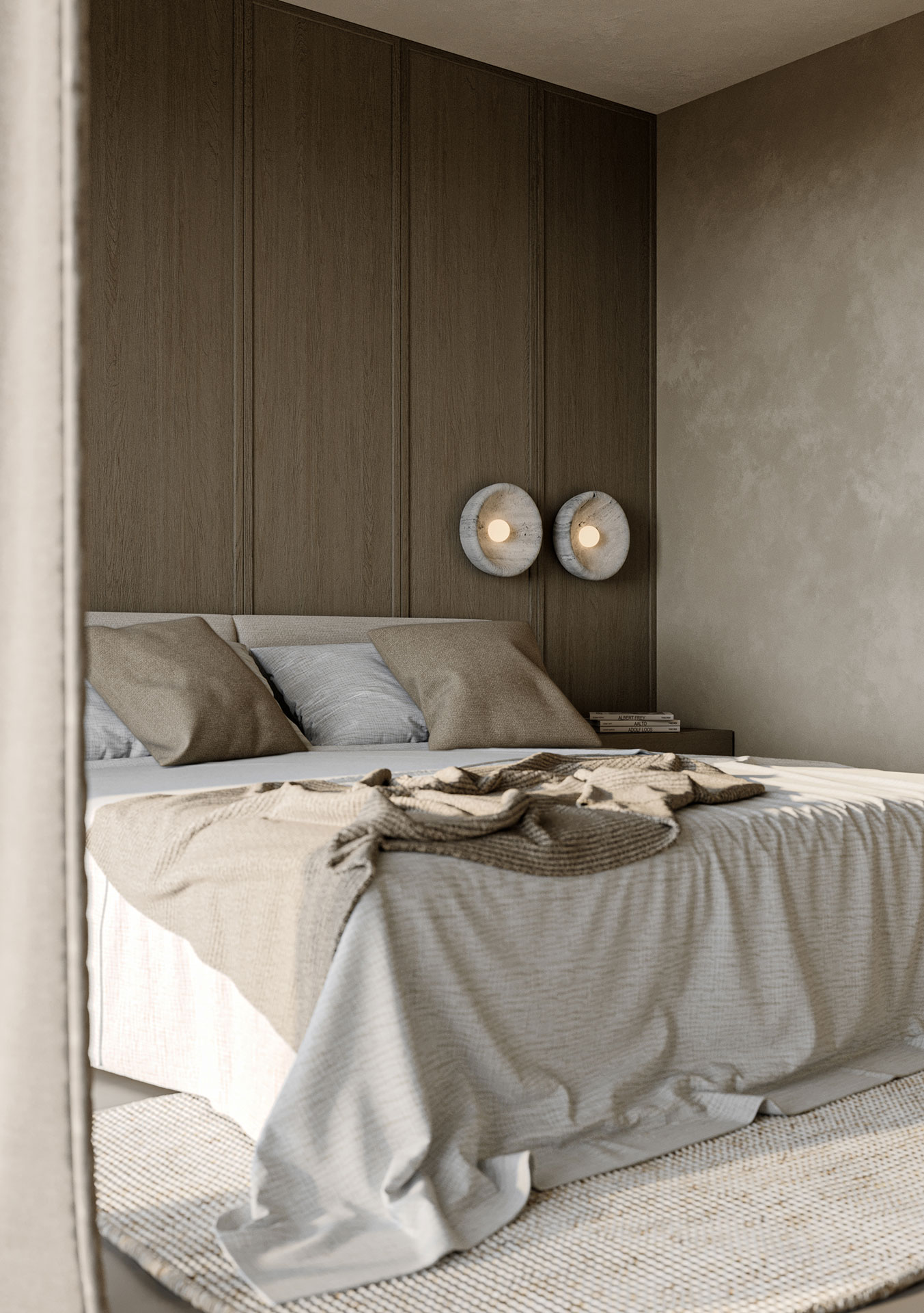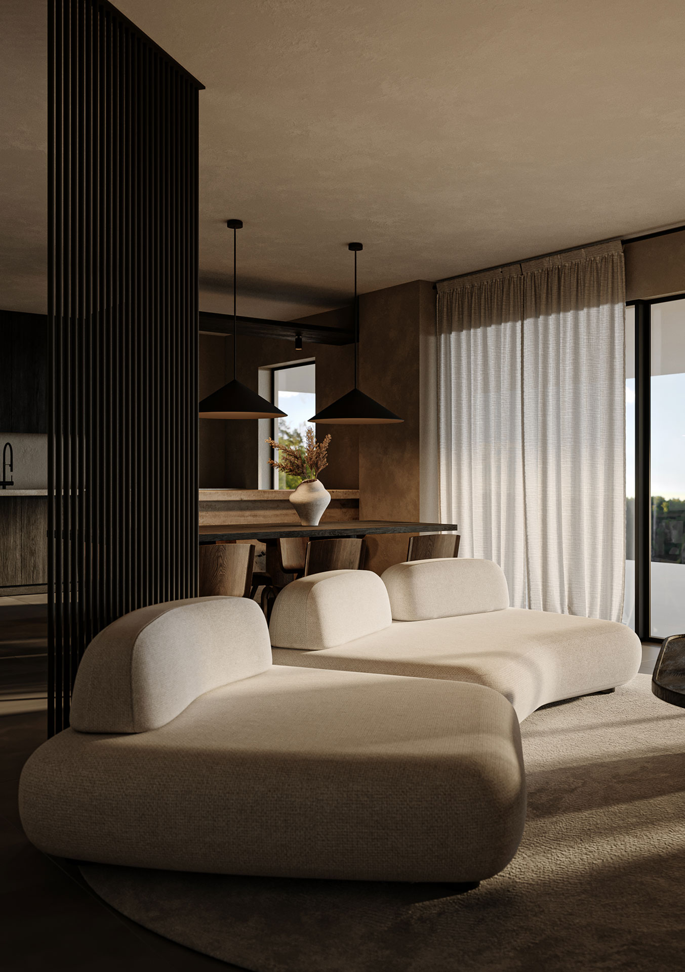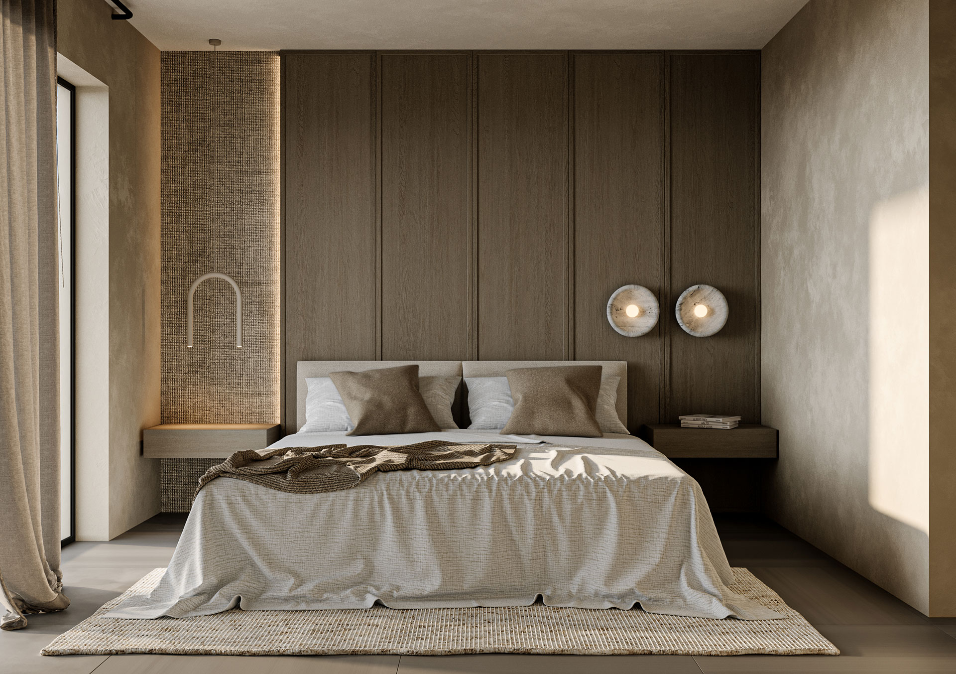 Our concept of slow living combines raw and Japandi trends with contemporary elements, creating a world of lights and shadows. Wood prevails, adding importance and majesty to the environment. Experience the harmonious blend of styles in this interior.